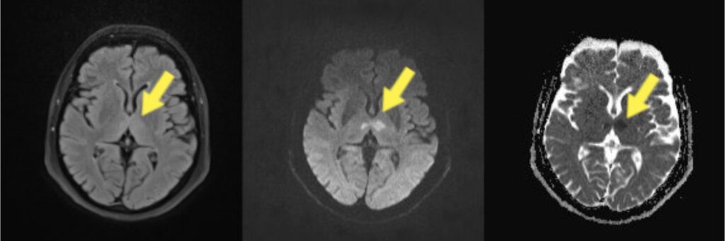 Slika 1. Radiološke snimke bolesnice. Na lijevoj slici prikazana je FLAIR sekvenca (engl. Fluid-Attenuated Inversion Recovery), na kojoj se uočava diskretna zona povišenog signala. Na istom mjestu, na DWI/ADC sekvencama (engl. Diffusion Weighted Imaging / Apparent Diffusion Coefficient), prikazanim na srednjoj i desnoj slici, vidi se restrikcija difuzije.