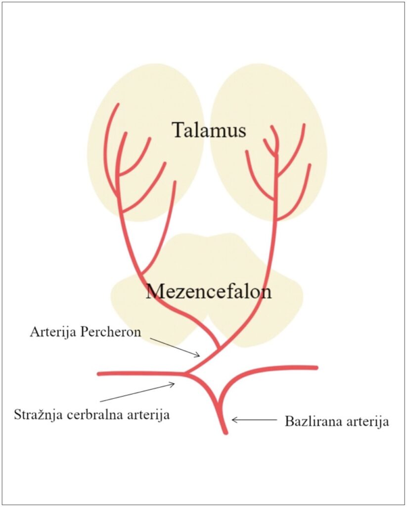 Talamus i mezencefalon opskrbljeni su krvlju od strane perforirajućih grana stražnje cerebralne i komunikantnih arterija (1,4). Paramedijani dijelovi talamusa i varijabilno mezencefalon najčešće su irigirani od strane parnih paramedijanih arterija koje su ogranci lijeve i desne stražnje cerebralne arterije (1,5). Međutim, u manjem broju ljudi (4-12 %) (4,5) navedeno područje opskrbljuje samo jedna arterija, arterija Percheron koja unilateralno polazi iz P1 segmenta stražnje cerebralne arterije. (1,2,4,5) (Slika 2).