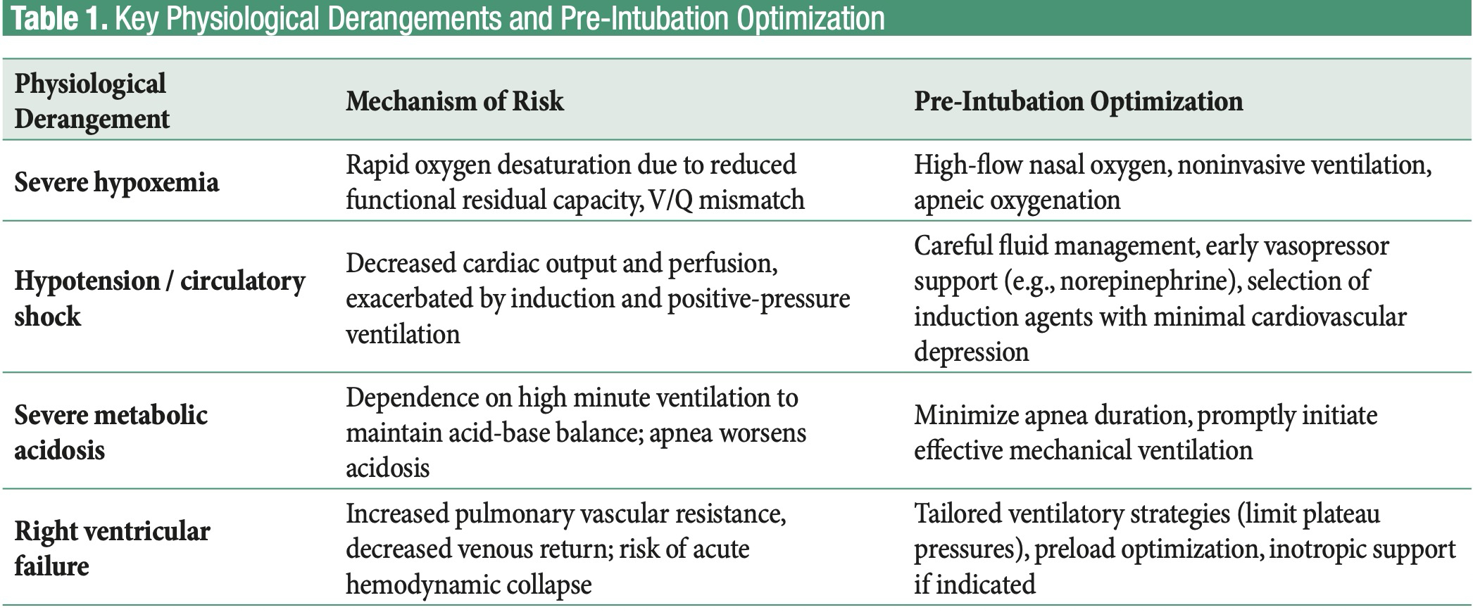 Four primary physiological derangements are associated with increased peri-intubation risk: severe hypoxemia, hypotension or circulatory shock, severe metabolic acidosis, and right ventricular failure. Other conditions, such as elevated intracranial pressure, obesity, or pregnancy, may further increase risk and should be considered during airway planning (6).