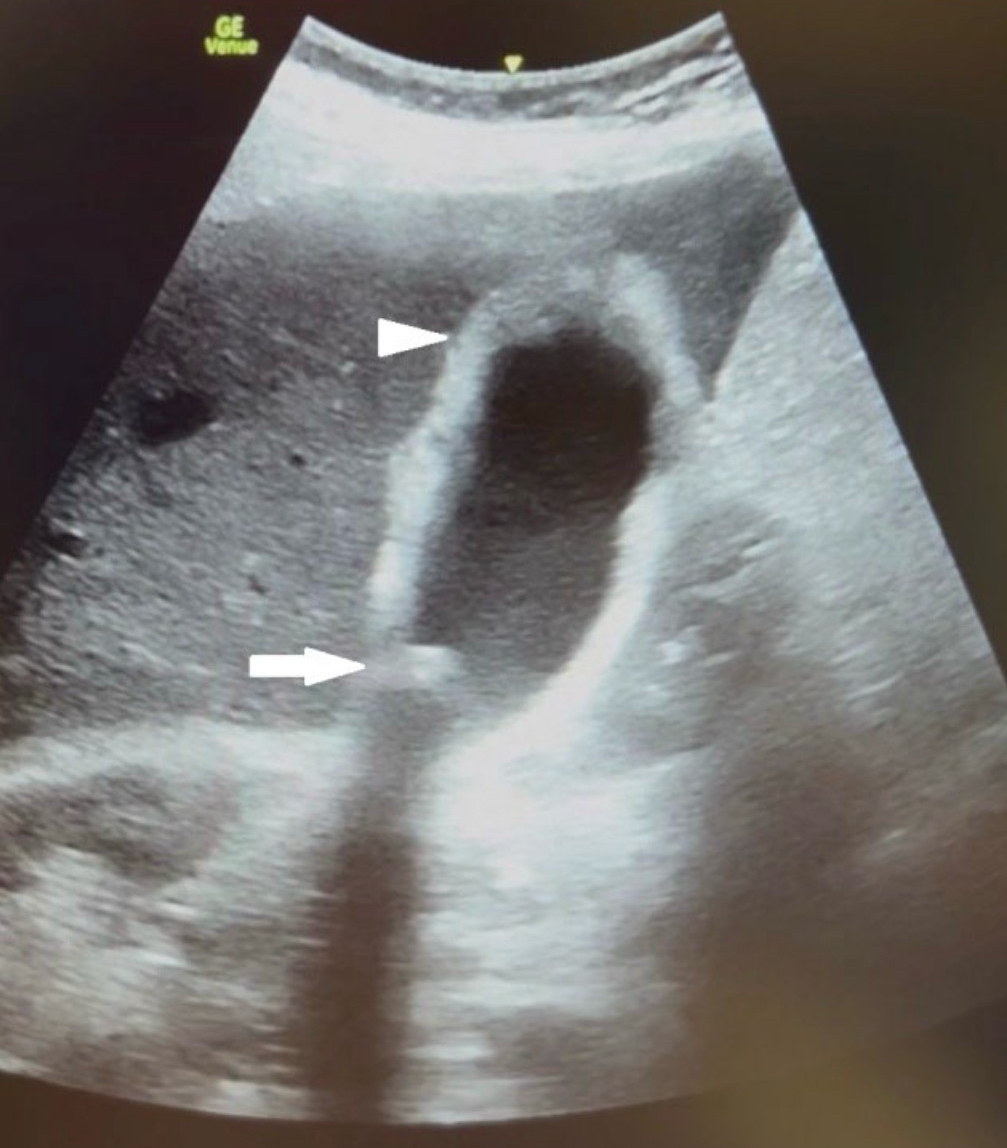 Figure 1. Pocus of the gallbladder showed an enlarged gallbladder (>10 cm) with a thickened and irregular wall (>5 mm) (white arrowhead) with a concretion in the neck of the gallbladder (white arrow)