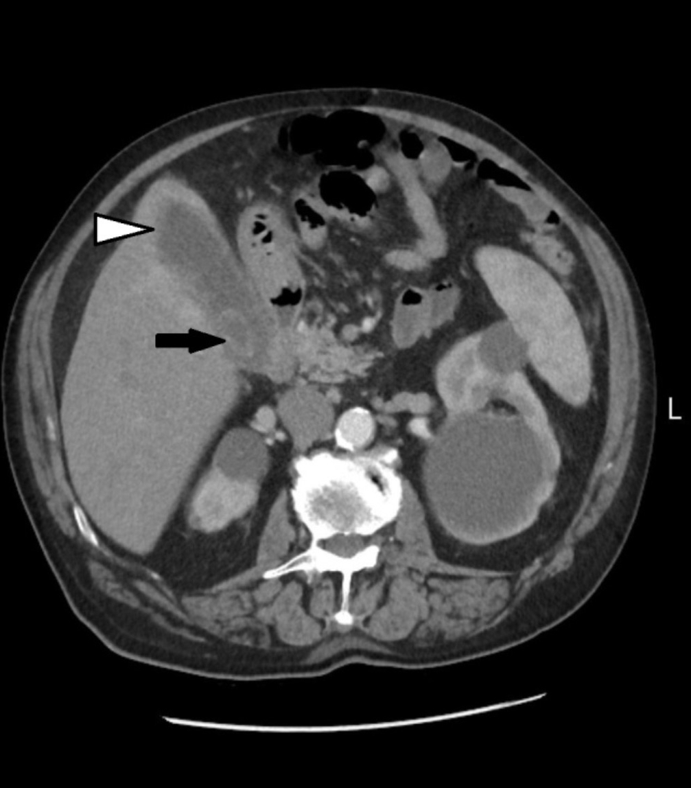 Figure 2. MSCT of the abdomen showed an enlarged gallbladder, thickened gallbladder wall (white arrowhead), and a calculus (black arrow)