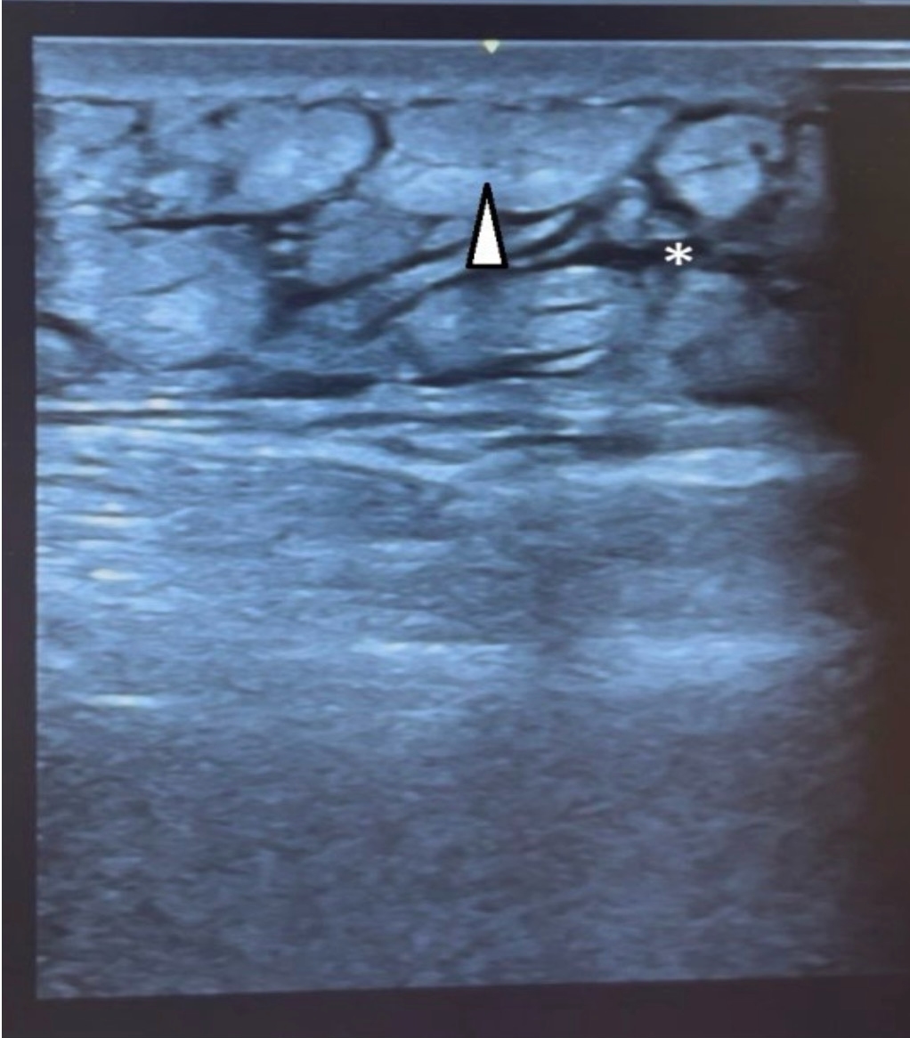 Figure 3. POCUS of the soft tissues of the left thigh showed thickened and heterogeneous subcutaneous fat with marked interstitial edema (asterix), a characteristic “cobblestone” appearance (white arrowhead), without clearly demarcated fluid collections and signs of abscess